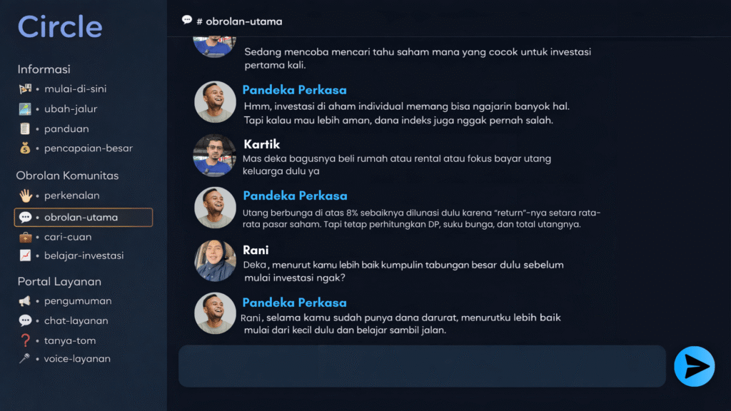 Lo bisa nanya kapan aja, bahas portfolio, strategi investasi, sampai news terbaru, diskusi langsung bareng member lain yang aktif dan saling bantu berkembang bareng.